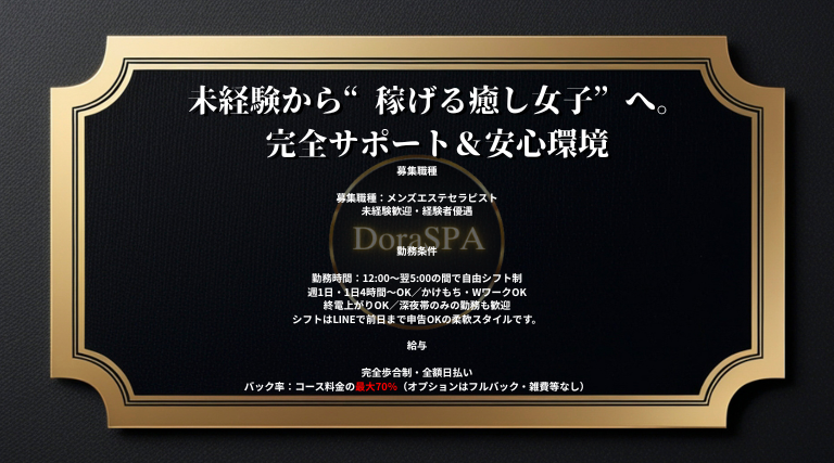 | 当店について | 大人のための上質なリラクゼーションを。DoraSPAは、八王子駅から徒歩5分の場所にあるメンズエステサロンです。 豊富な施術メニューと、洗練されたセラピストが一人ひとりの疲れやストレスに寄り添い、心と身体を深いリラックスへ導きます。 高級感のある落ち着いた空間で、日常を忘れる特別なひとときをお過ごしください。 ※当サロンは風俗店ではございません。 |