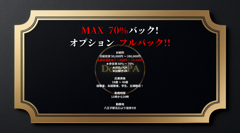 | 給与 | 完全歩合制で、売上に応じてランクとバック率が変動する仕組みです。 完全歩合制:売上額に応じて報酬が決まります。 売上の最大70%をバック。 売上に応じてランクが変わり、ランクごとにバック率が変動します。 オプション料金はすべて本人への全額バック。 |